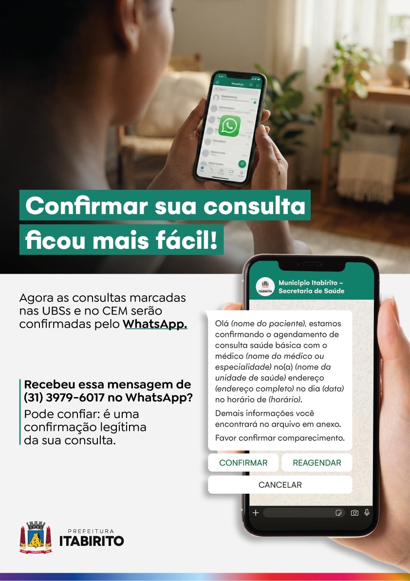 A Prefeitura de Itabirito, através da Secretaria de Saúde, implementou uma novidade que promete simplificar a confirmação de consultas nas Unidades Básicas de Saúde (UBSs) e no Centro de Especialidades Médicas (CEM). Agora, os pacientes poderão confirmar suas consultas de forma prática e rápida por meio do WhatsApp.Ao receber uma mensagem do número (31) 3979-6017, os pacientes são convidados a confirmar, reagendar ou cancelar suas consultas diretamente pelo aplicativo. Essa iniciativa visa melhorar a comunicação entre os usuários e os serviços de saúde, garantindo que todos estejam cientes de seus compromissos.A medida não apenas facilita a vida dos cidadãos, mas também otimiza o agendamento e a gestão das consultas, contribuindo para um atendimento mais eficaz e organizado. A Prefeitura reforça que é importante confiar nas informações recebidas por esse canal oficial.Com essa inovação, Itabirito dá mais um passo em direção à modernização dos serviços públicos, utilizando a tecnologia para proporcionar mais conforto e agilidade aos moradores.